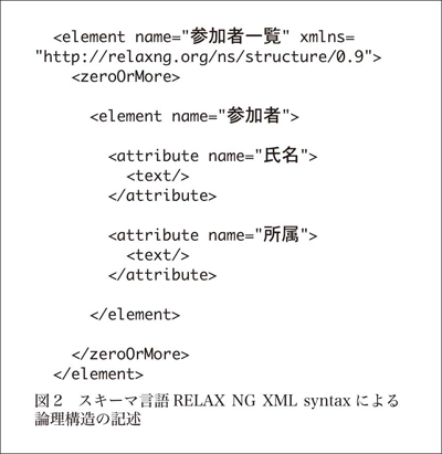 SGML においては,共通する論理的要素とその構造を定義するスキーマ言語としてDTD だけが使われていたが,XML の普及と共にXML の構文を使ったスキーマ言語(W3C XML Schema,RELAX NG XML syntax)が利用可能になり,さらに簡素な記述を可能にするRELAX NGcompact syntax がISO/IEC 19757−2 として制定された。図1 〜 3 にそれぞれXML DTD,RELAX NG XML syntax,RELAX NG compactsyntax による論理構造の記述例を,その入れ子構造を図4 に示す。データ型の規定,XML 名前空間なども次々と開発されて,XML はいわゆる文書だけでなく,一般的なデータの構造を記述する言語として,プロトコルの記述などにも広く利用されている。
