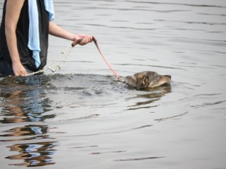 一回目のお台場では、ロングリードを持っていかなかったため 泳ぐ練習ができなかった点。 今回は、ばっちり用意したから、泳げるようになって帰ろうね! という人間の勝手なもくろみも知らず、点は波打ち際ではしゃいでおりました。